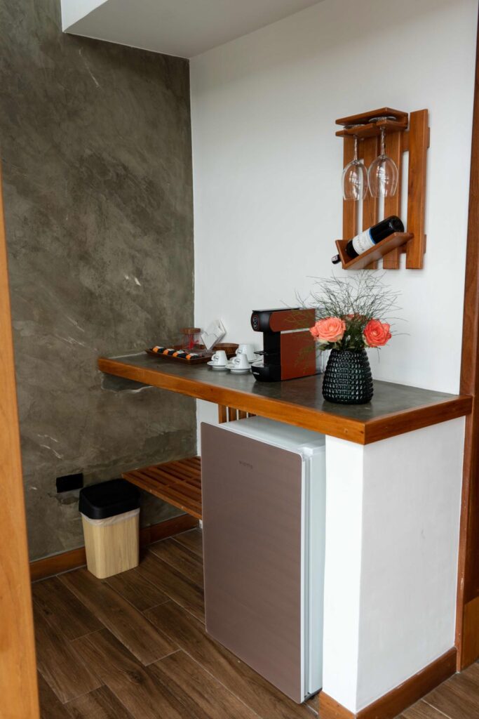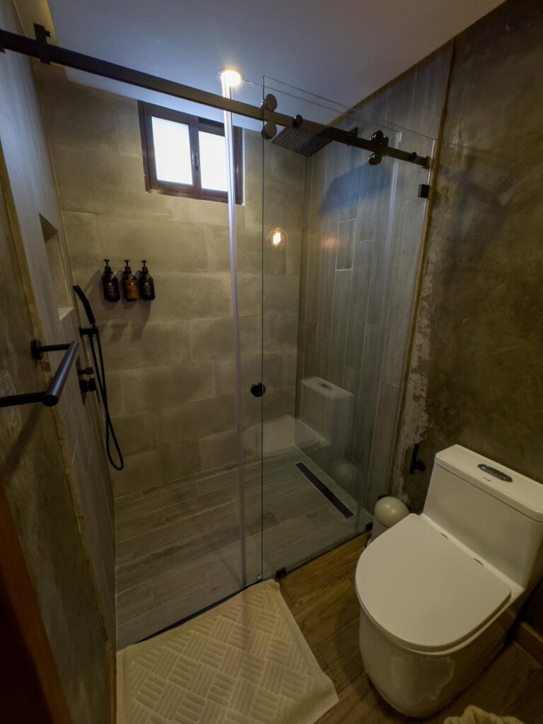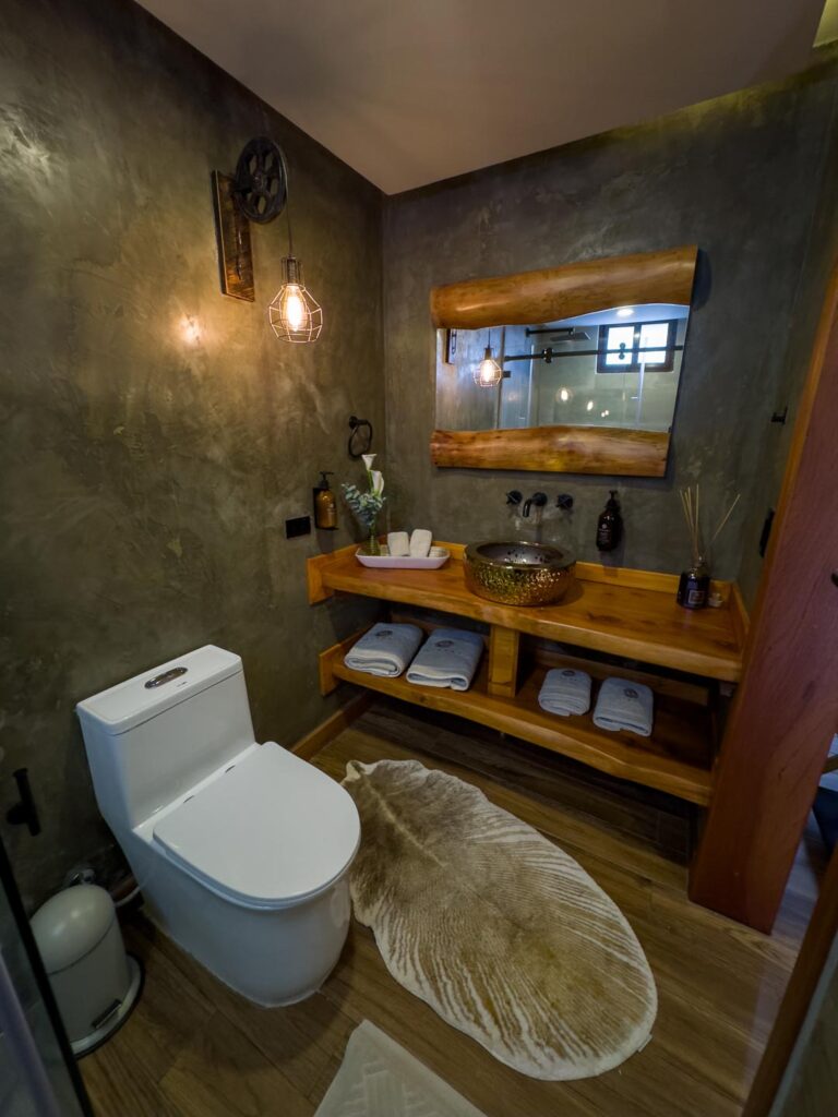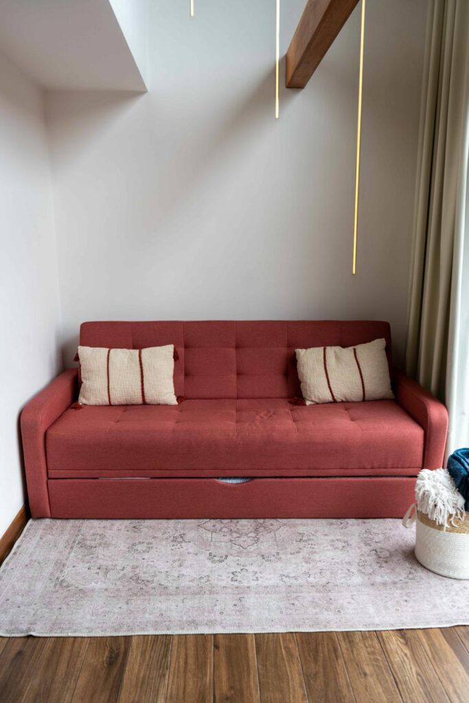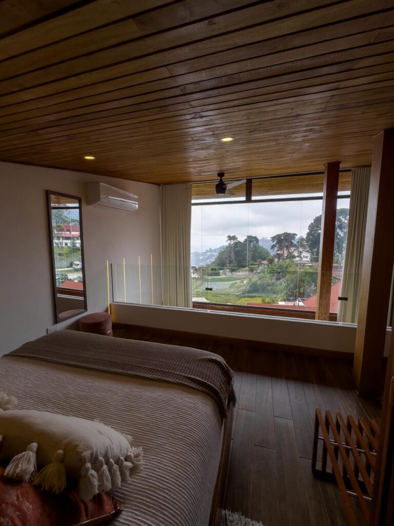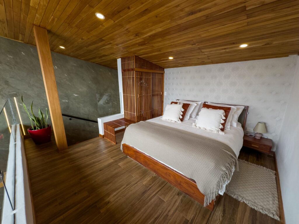 Habitación de dos pisos equipada con cama queen, closet, sofá cama para dos personas, baño, nevera, aire acondicionado y cortinas blackout automáticas.