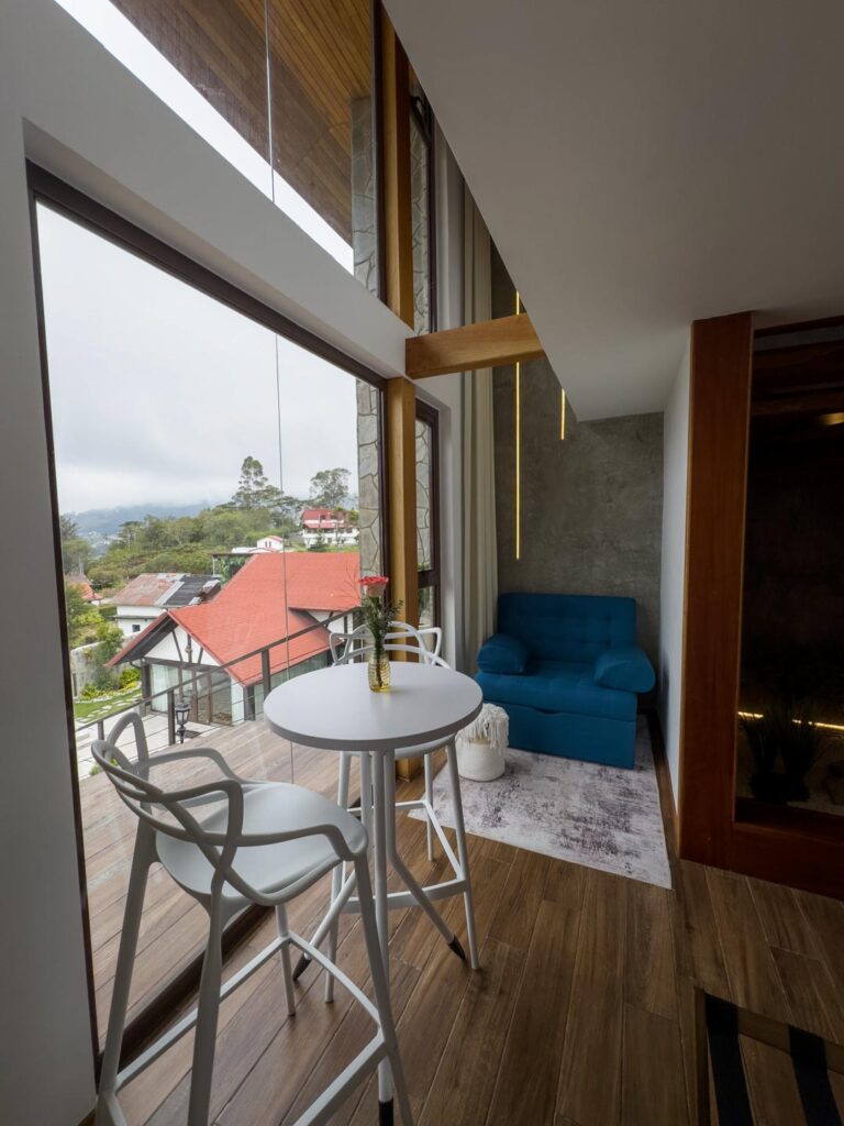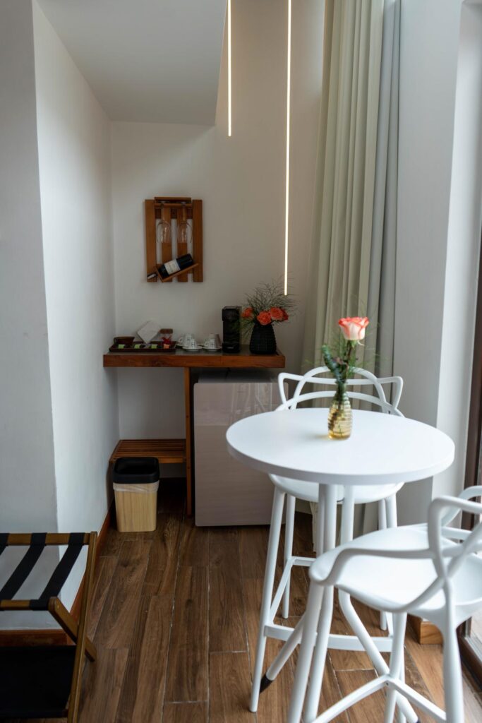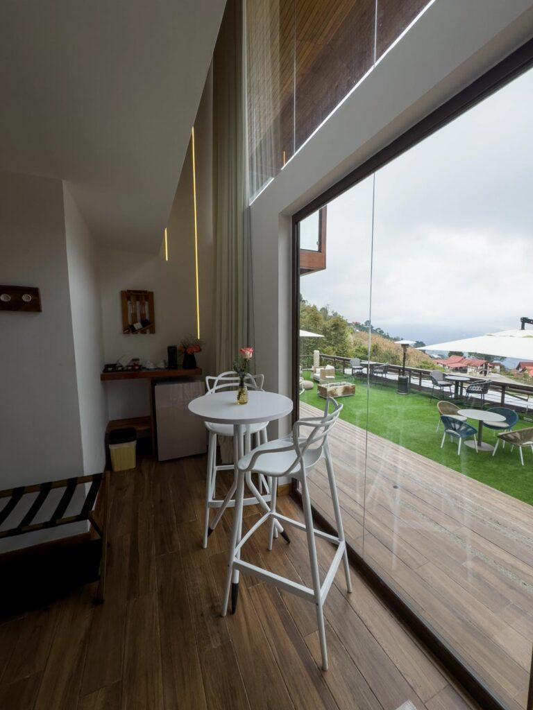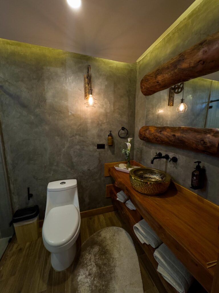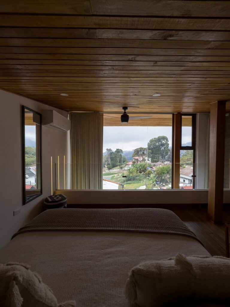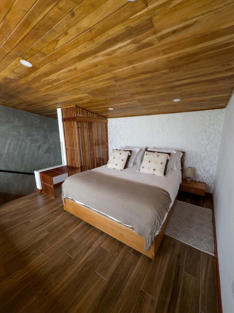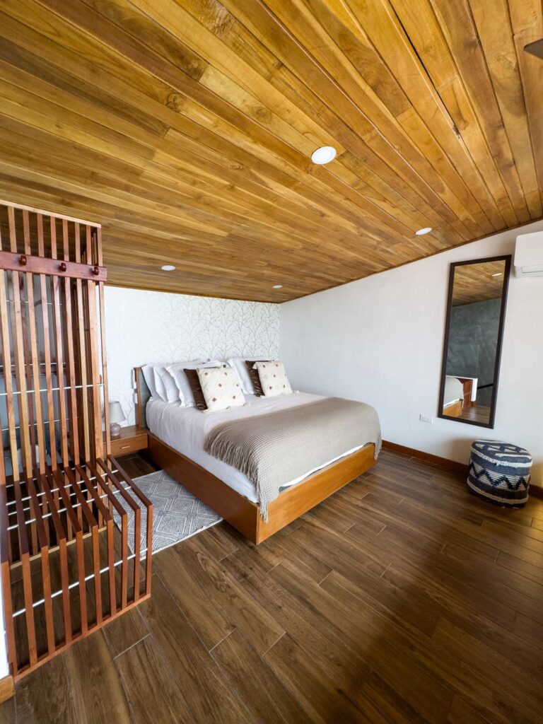 Habitación de dos pisos equipada con cama queen, closet, sofá cama individual, baño, nevera, aire acondicionado y cortinas blackout automáticas.