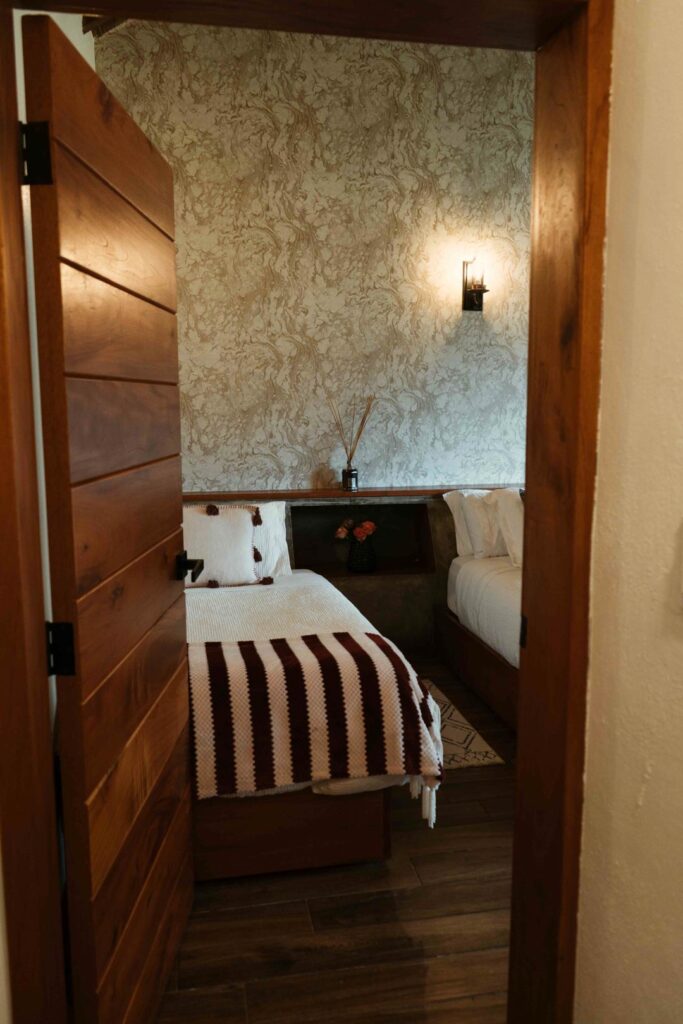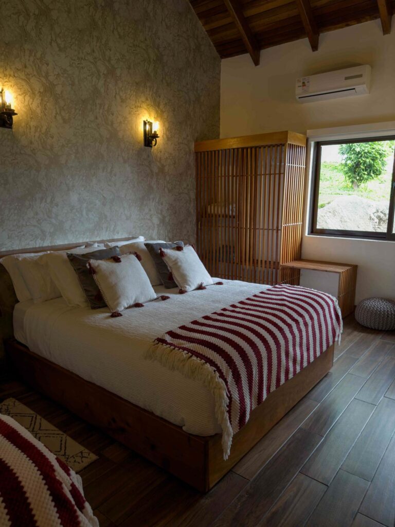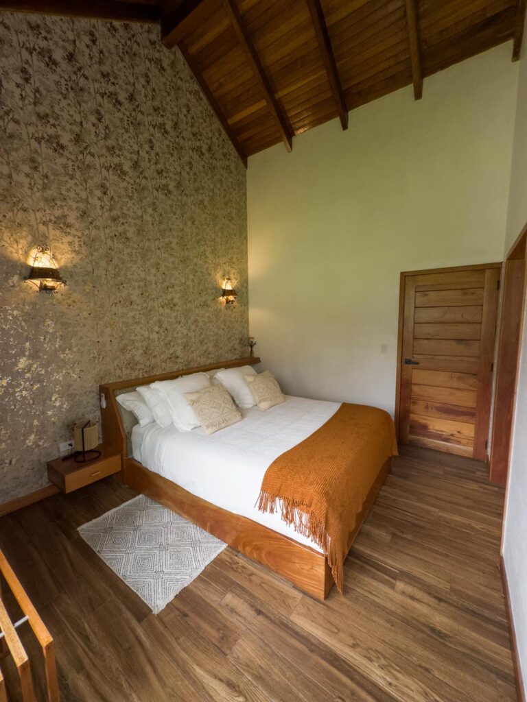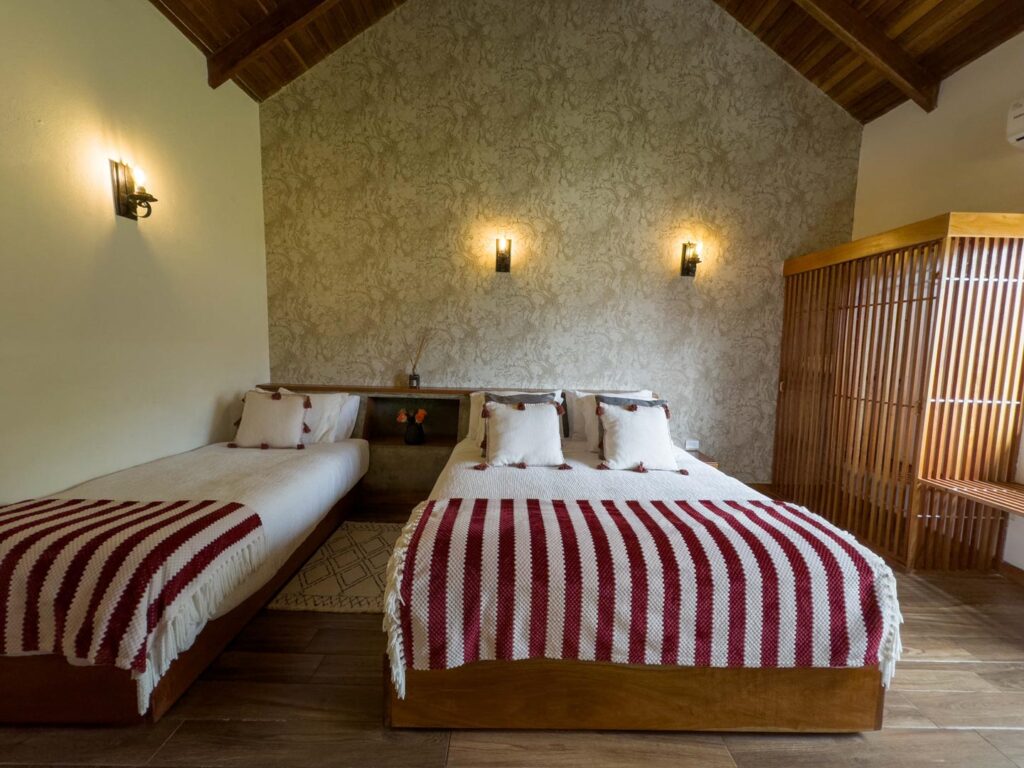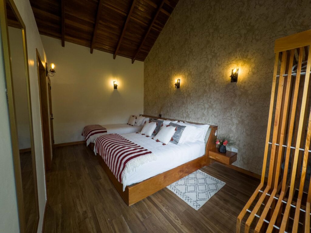 Habitación dúplex equipada con dos camas queen y una individual, dos closets, sala de baño compartida y aire acondicionado.